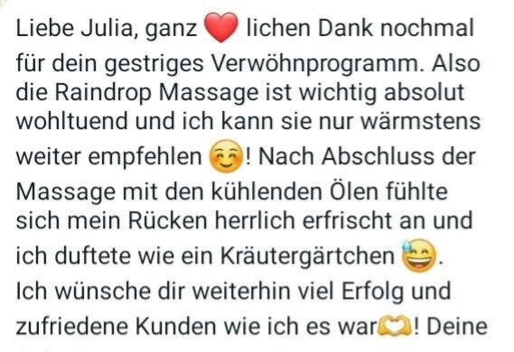 Positives Kundenfeedback lässt mein Herz höher schlagen. Mein Anspruch, meinen Kundinnen und Kunden stets eine entspannende und schöne Auszeit zu bieten ist hoch. Sollte einmal etwas nicht so gepasst haben, bin ich gern für konstruktive Kritik offen, denn nur so kann ich für und mit euch weiter wachsen.