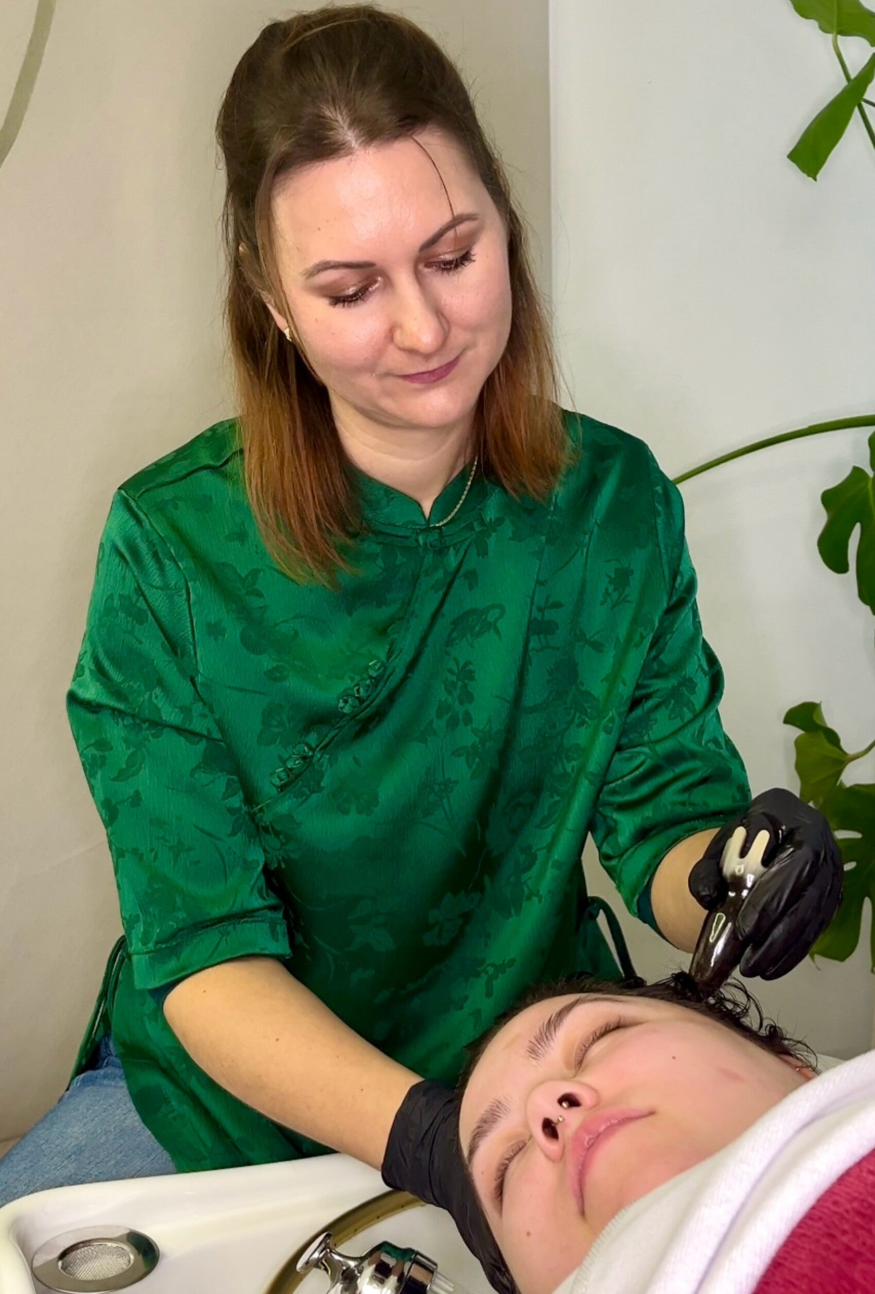 Kopfmassage mit Gua Sha Werkzeugen, spezielles Kopfhautpeeling, chinesische Kopfwaschung, intensiv pflegende Haarkur, Dampfbad, Föhnen